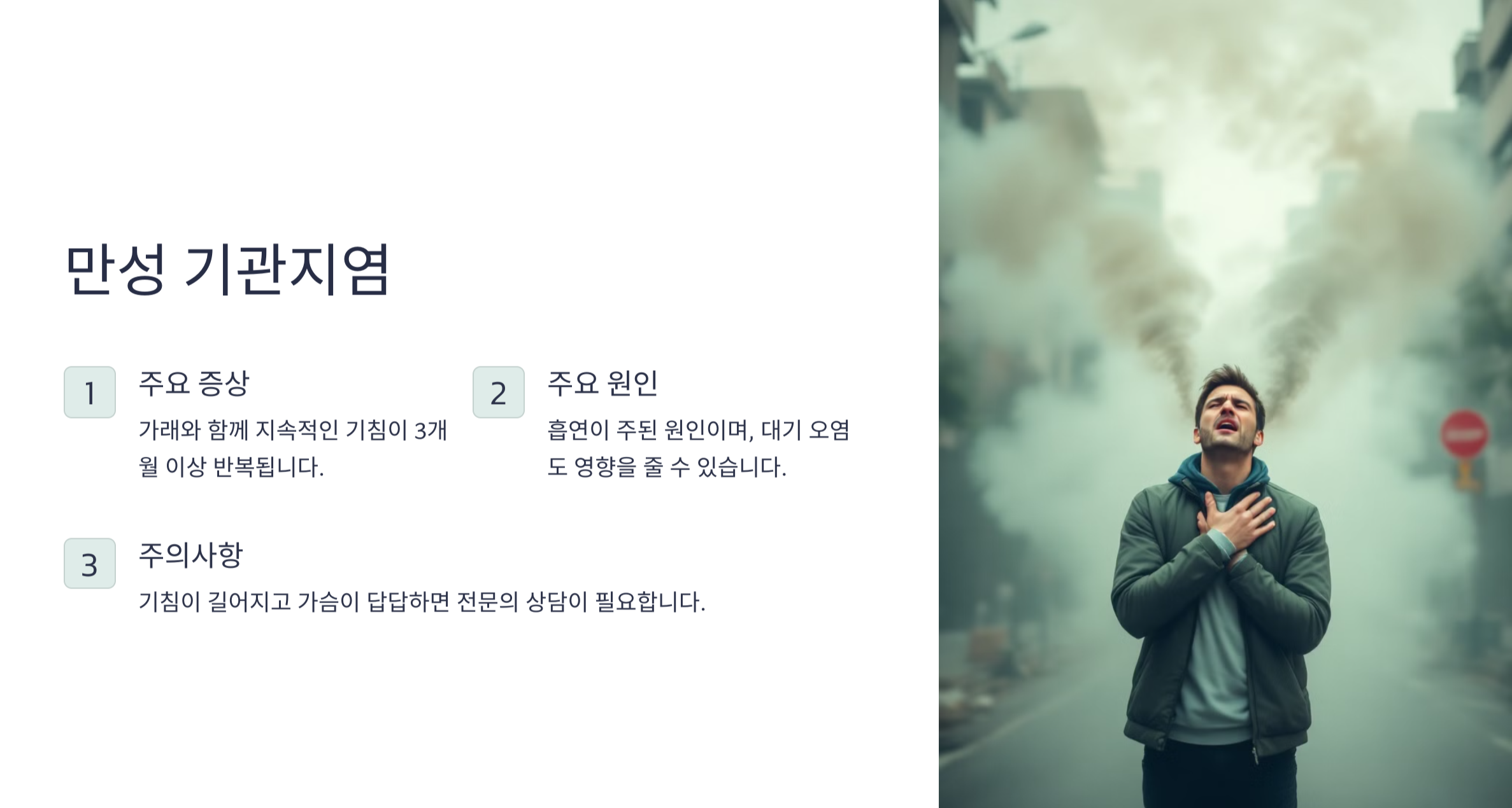 만성 기관지염은 기도에 염증이 생기면서 발생하는 질환으로, 주로 흡연자에게서 많이 나타납니다. 가래와 함께 지속적인 기침이 대표적인 증상이며, 3개월 이상 반복되는 경우 만성으로 진단될 수 있습니다. 만성 기관지염은 폐기종과 함께 만성 폐쇄성 폐질환(COPD)의 한 종류로 간주됩니다.