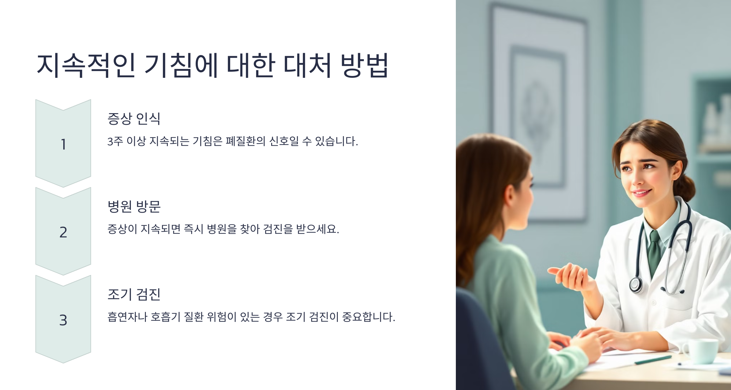 지속적인 기침은 단순 감기가 아닌 폐질환의 신호일 수 있으므로, 증상이 계속된다면 즉시 병원을 찾아야 합니다. 특히 흡연자나 호흡기 질환의 위험 요인이 있는 경우에는 조기에 검진을 받는 것이 중요합니다. 기침은 몸의 이상 신호를 보내는 중요한 증상이므로, 이를 가볍게 넘기지 않도록 주의해야 합니다.