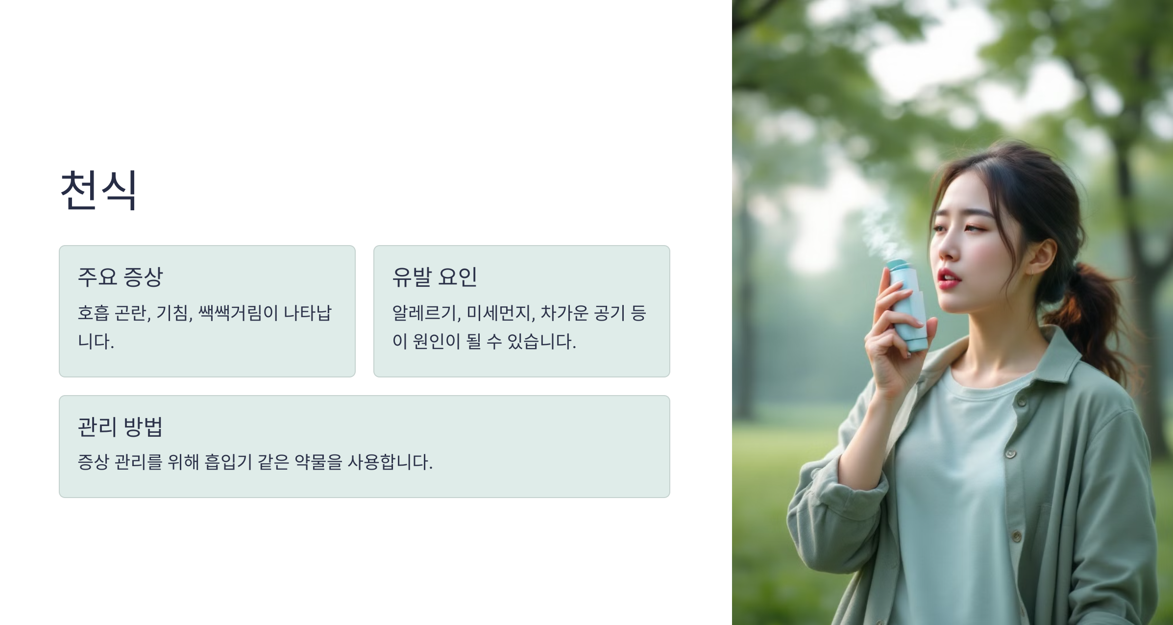 천식 환자들은 증상을 관리하기 위해 흡입기 같은 약물을 사용하는 경우가 많습니다. 증상이 지속되거나 악화될 경우 전문의와 상담을 통해 정확한 진단과 치료 방법을 찾아야 합니다.