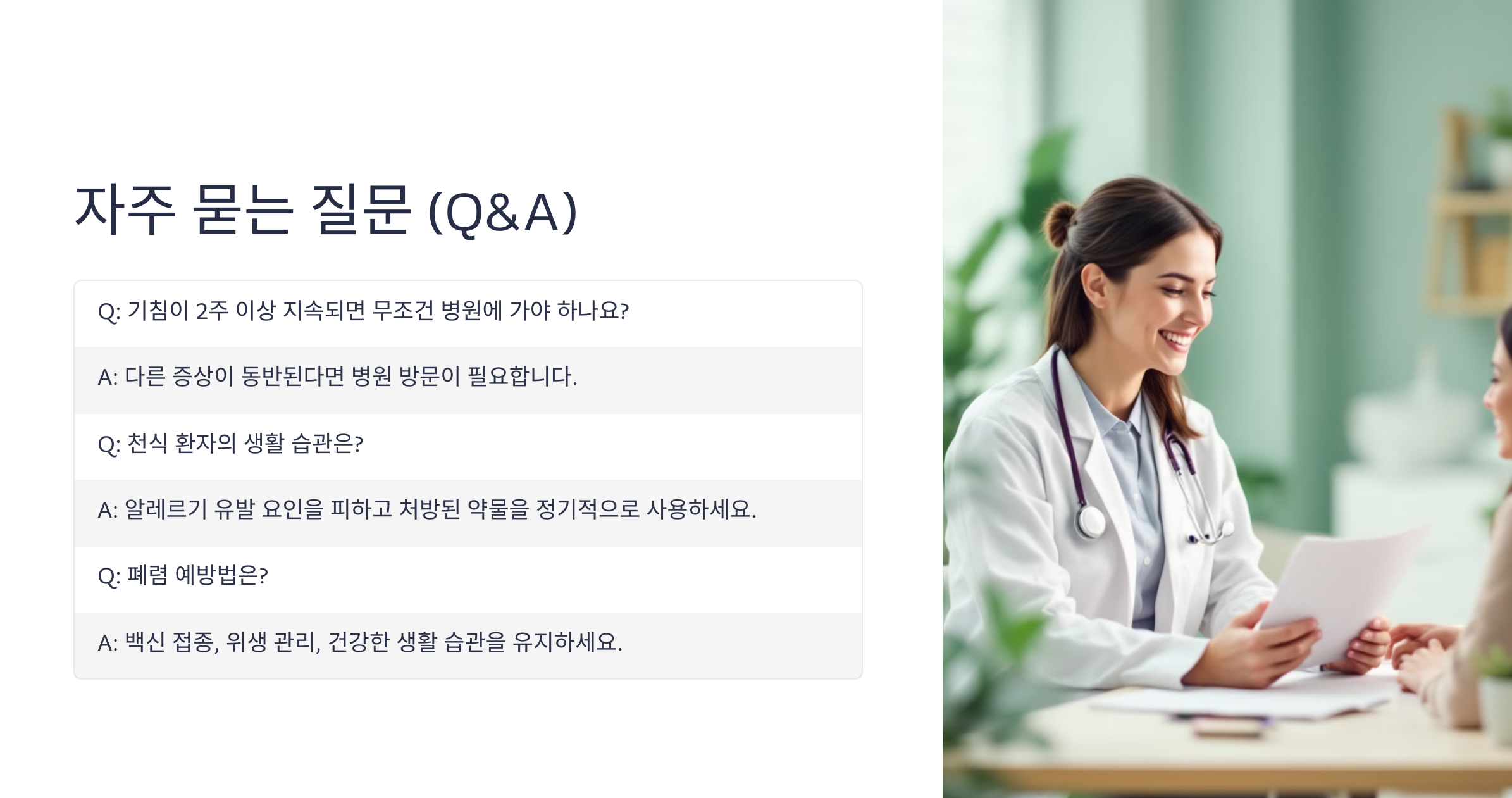 A1. 기침이 2주 이상 지속된다면 단순 감기가 아닐 수 있습니다. 특히, 다른 증상(고열, 흉통, 체중 감소 등)이 동반된다면 병원을 방문해 정확한 진단을 받는 것이 중요합니다.