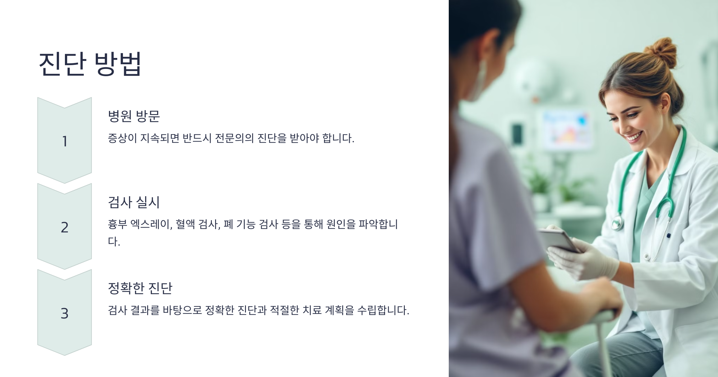A2: 흉부 엑스레이, 폐 기능 검사, 혈액 검사 등이 주요 검사로 사용됩니다. 필요한 경우 추가적인 영상 검사나 내시경 검사가 필요할 수 있습니다.