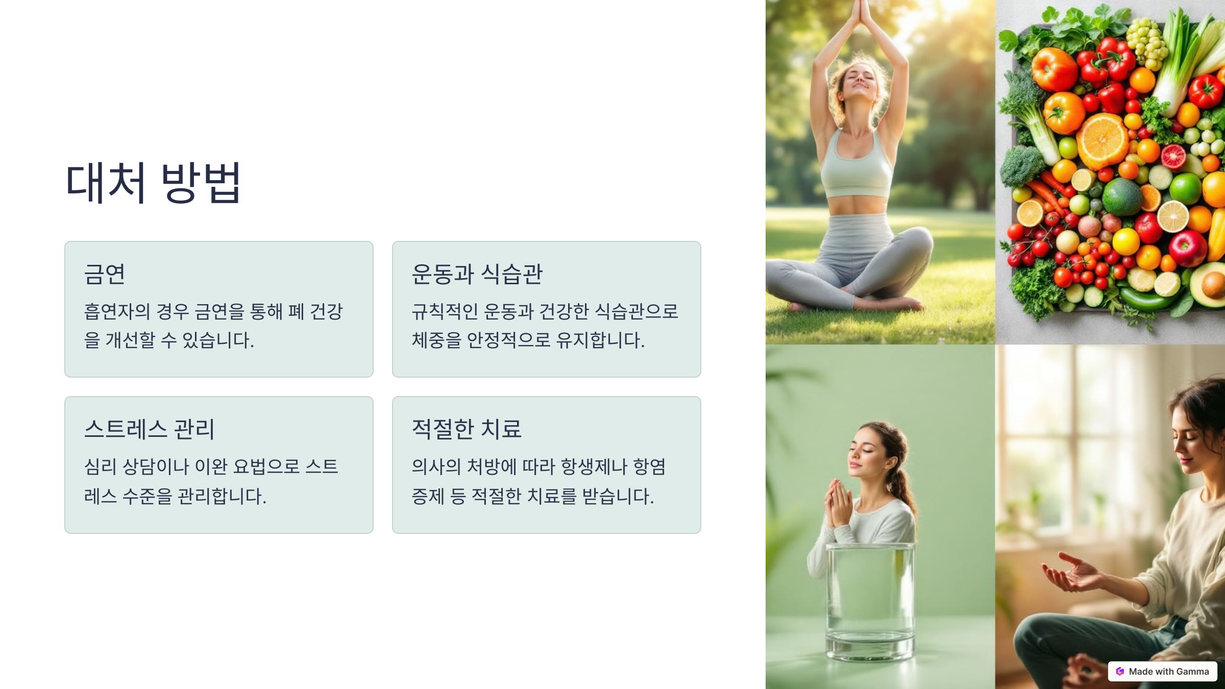 특히 흡연자는 금연을 통해 폐 건강을 개선하고 기침을 완화할 수 있습니다. 또한 규칙적인 운동과 건강한 식습관을 유지함으로써 체중을 안정적으로 유지하는 것이 중요합니다. 만약 스트레스가 원인일 경우, 심리 상담이나 이완 요법을 통해 스트레스 수준을 관리하는 것도 좋은 방법입니다.