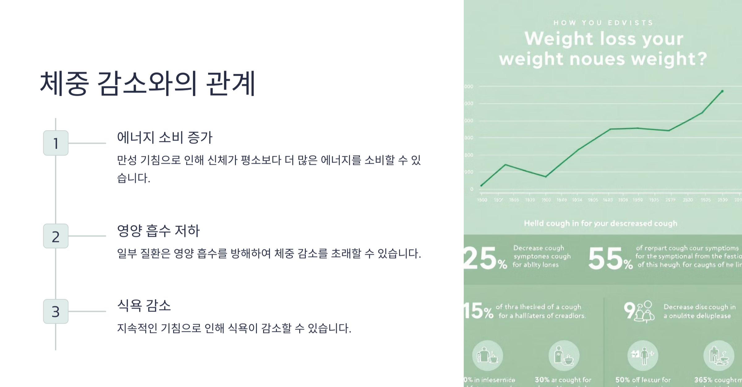 체중 감소는 몸이 에너지를 과도하게 소모하고 있거나, 흡수할 영양분이 부족하다는 신호일 수 있습니다. 따라서 기침과 함께 원인을 알 수 없는 체중 감소가 지속된다면, 즉시 병원에서 진료를 받아보는 것이 바람직합니다.