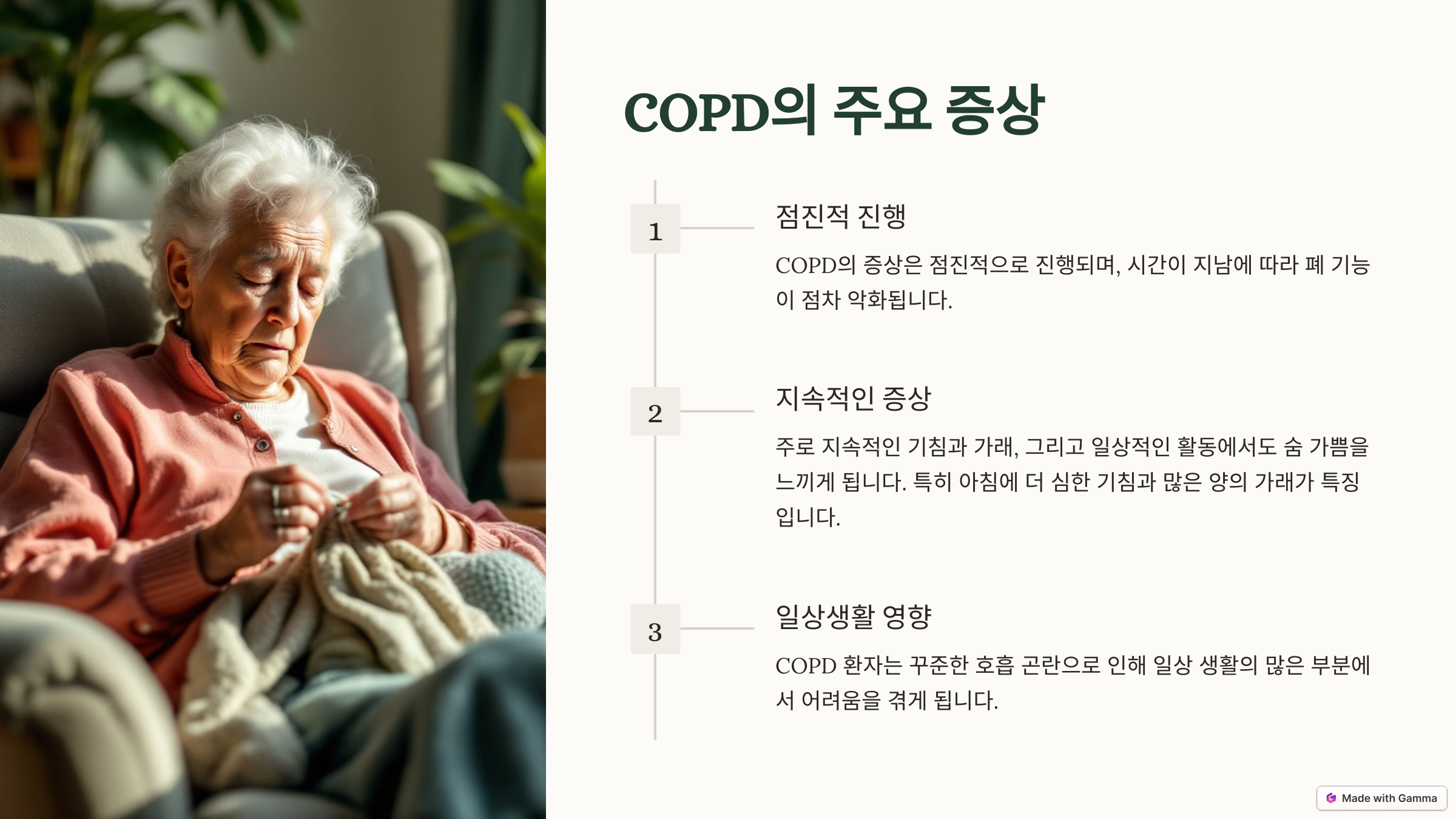 COPD의 증상은 점진적으로 진행되며, 주로 지속적인 기침과 가래, 그리고 일상적인 활동에서도 숨 가쁨을 느끼게 됩니다. 특히 아침에 더 심한 기침과 많은 양의 가래가 특징입니다. COPD는 시간이 지남에 따라 폐 기능이 점차 악화되어 증상이 지속적이며, 발작보다는 꾸준한 호흡 곤란이 특징입니다. 이러한 차이로 인해 COPD 환자는 일상 생활의 많은 부분에서 어려움을 겪게 됩니다.