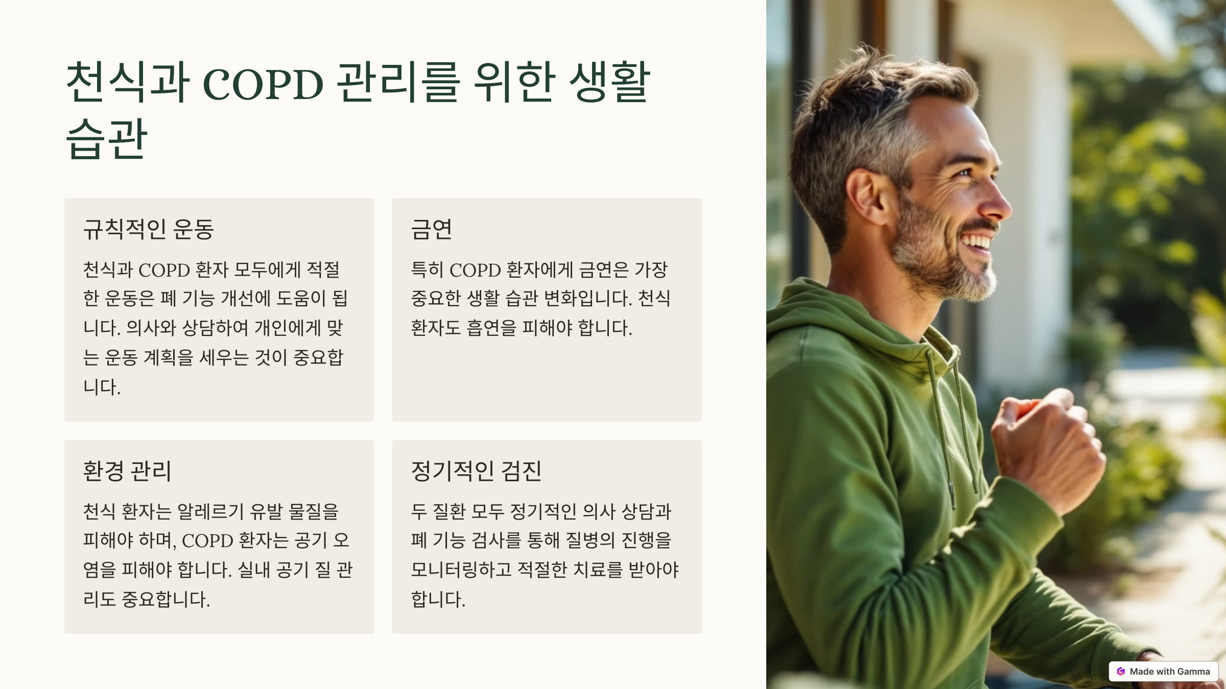 Q3: COPD 환자가 할 수 있는 가장 중요한 생활 습관 변화는 무엇인가요?