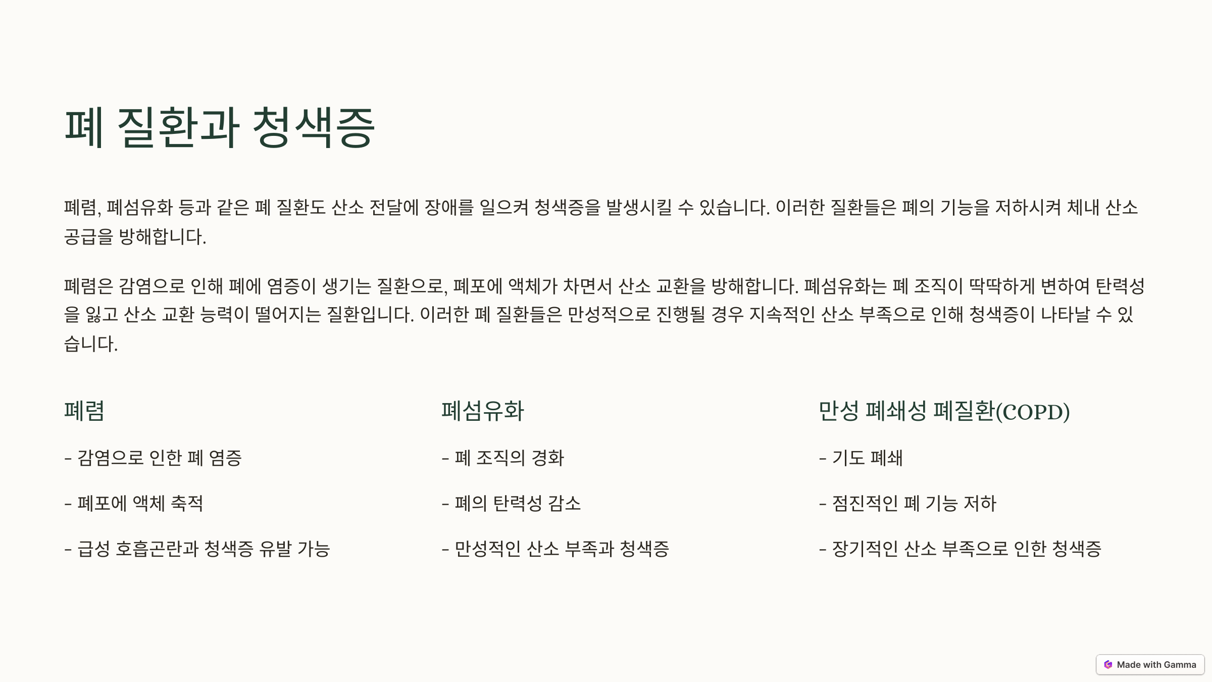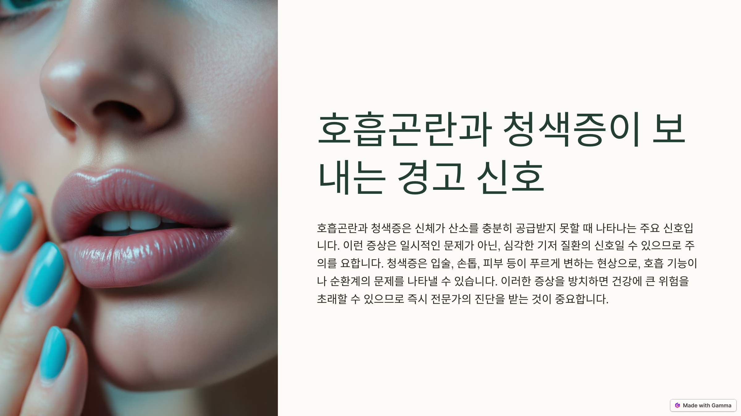 호흡곤란과 청색증은 신체가 산소를 충분히 공급받지 못할 때 나타나는 주요 신호입니다. 이런 증상은 일시적인 문제가 아닌, 심각한 기저 질환의 신호일 수 있으므로 주의를 요합니다. 청색증은 입술, 손톱, 피부 등이 푸르게 변하는 현상으로, 호흡 기능이나 순환계의 문제를 나타낼 수 있습니다. 이러한 증상을 방치하면 건강에 큰 위험을 초래할 수 있으므로 즉시 전문가의 진단을 받는 것이 중요합니다.