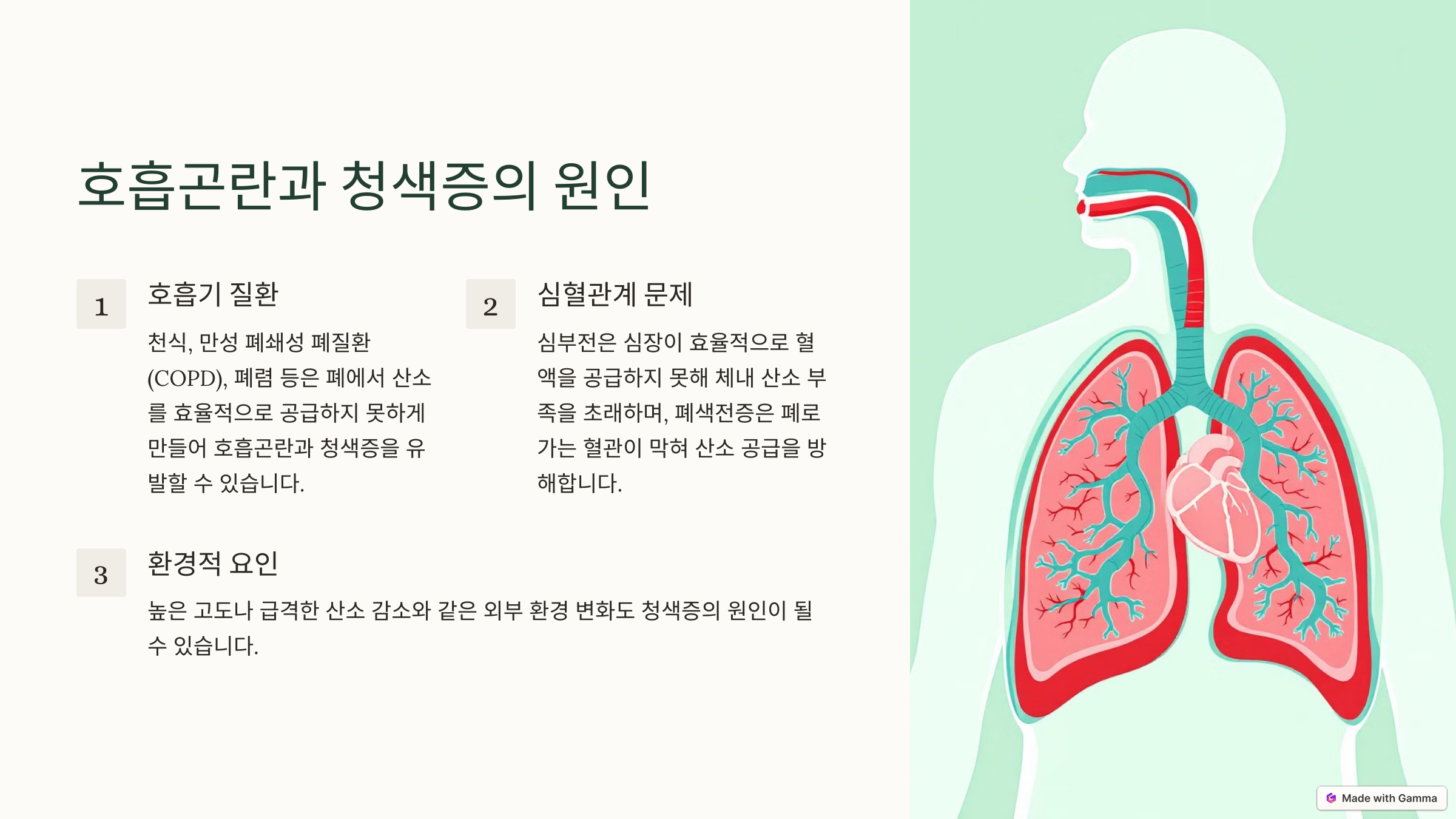 호흡곤란과 청색증은 다양한 원인에 의해 발생할 수 있습니다. 대표적인 원인으로는 천식, 만성 폐쇄성 폐질환(COPD), 폐렴과 같은 호흡기 질환이 있습니다. 천식이나 폐렴은 폐에서 산소를 효율적으로 공급하지 못하게 만들어 호흡곤란과 함께 청색증이 발생할 수 있습니다. 또한, 심부전이나 폐색전증 같은 심혈관계 문제도 청색증을 일으킬 수 있습니다.