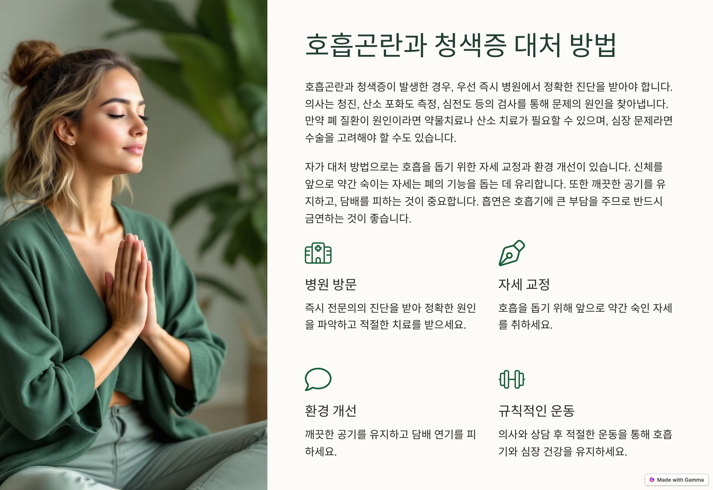 호흡곤란과 청색증이 발생한 경우, 우선 즉시 병원에서 정확한 진단을 받아야 합니다. 의사는 청진, 산소 포화도 측정, 심전도 등의 검사를 통해 문제의 원인을 찾아냅니다. 만약 폐 질환이 원인이라면 약물치료나 산소 치료가 필요할 수 있으며, 심장 문제라면 수술을 고려해야 할 수도 있습니다.