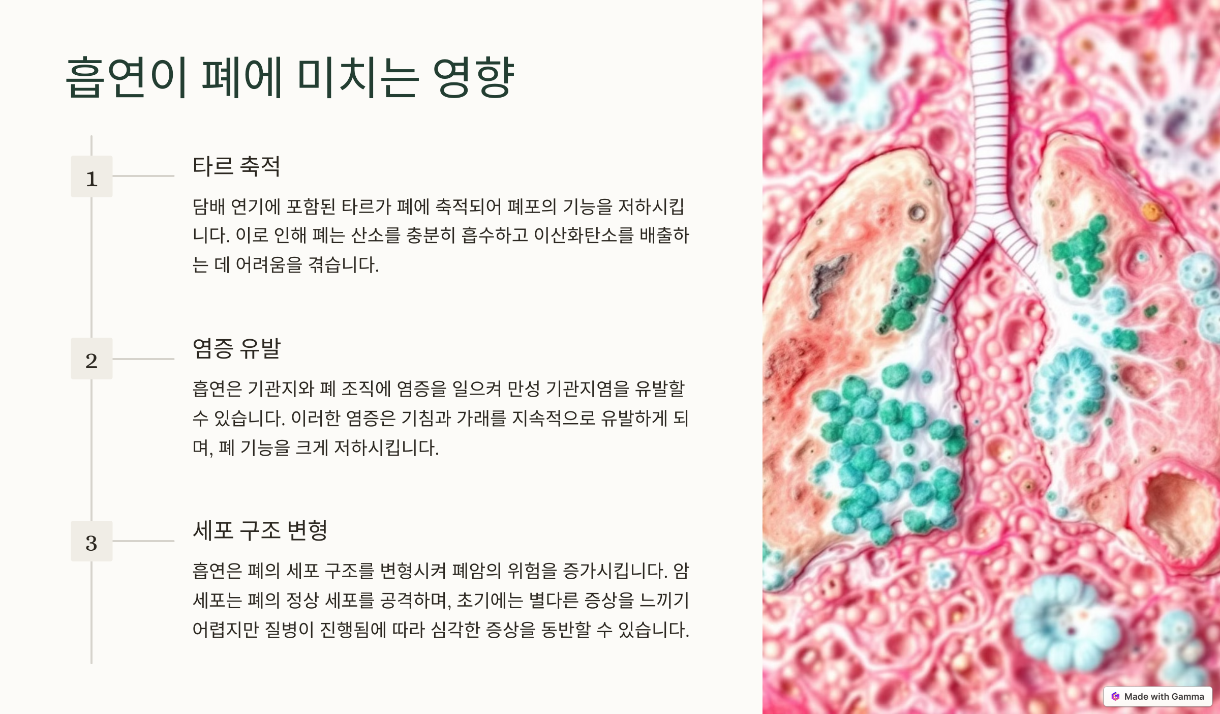 흡연은 또한 폐의 세포 구조를 변형시켜 폐암의 위험을 증가시킵니다. 암세포는 폐의 정상 세포를 공격하며, 초기에는 별다른 증상을 느끼기 어렵지만 질병이 진행됨에 따라 흉통, 체중 감소, 호흡 곤란 등의 심각한 증상을 동반할 수 있습니다. 흡연으로 인한 이러한 폐 손상은 대부분 회복하기 어려우며, 흡연 기간이 길수록 그 위험도는 증가합니다.