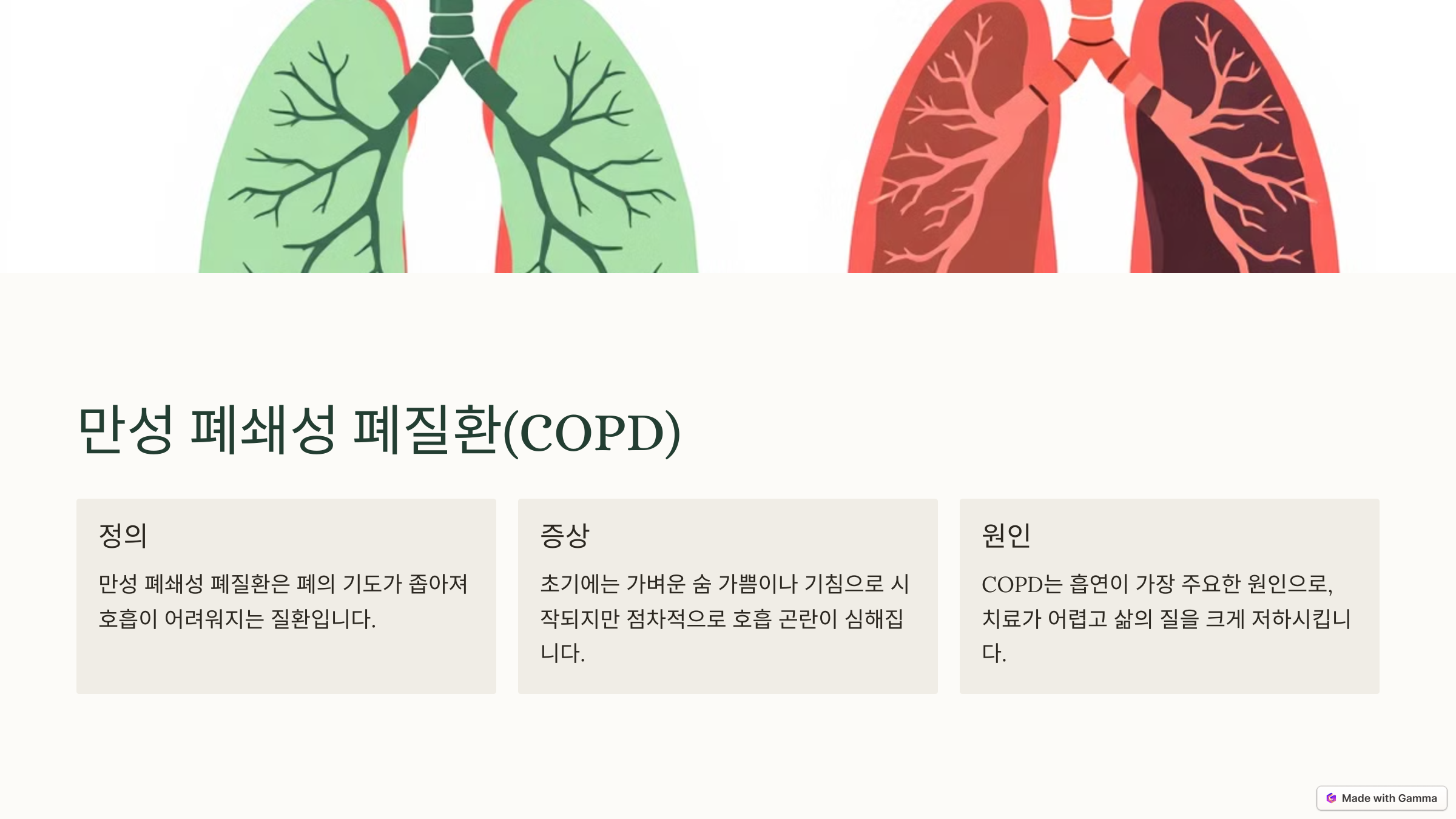 흡연은 다양한 폐 질환의 주요 원인입니다. 대표적인 질환으로는 만성 폐쇄성 폐질환(COPD), 폐기종, 그리고 폐암이 있습니다. 만성 폐쇄성 폐질환은 폐의 기도가 좁아져 호흡이 어려워지는 질환으로, 초기에는 가벼운 숨 가쁨이나 기침으로 시작되지만 점차적으로 호흡 곤란이 심해집니다. COPD는 흡연이 가장 주요한 원인으로, 치료가 어렵고 삶의 질을 크게 저하시킵니다.