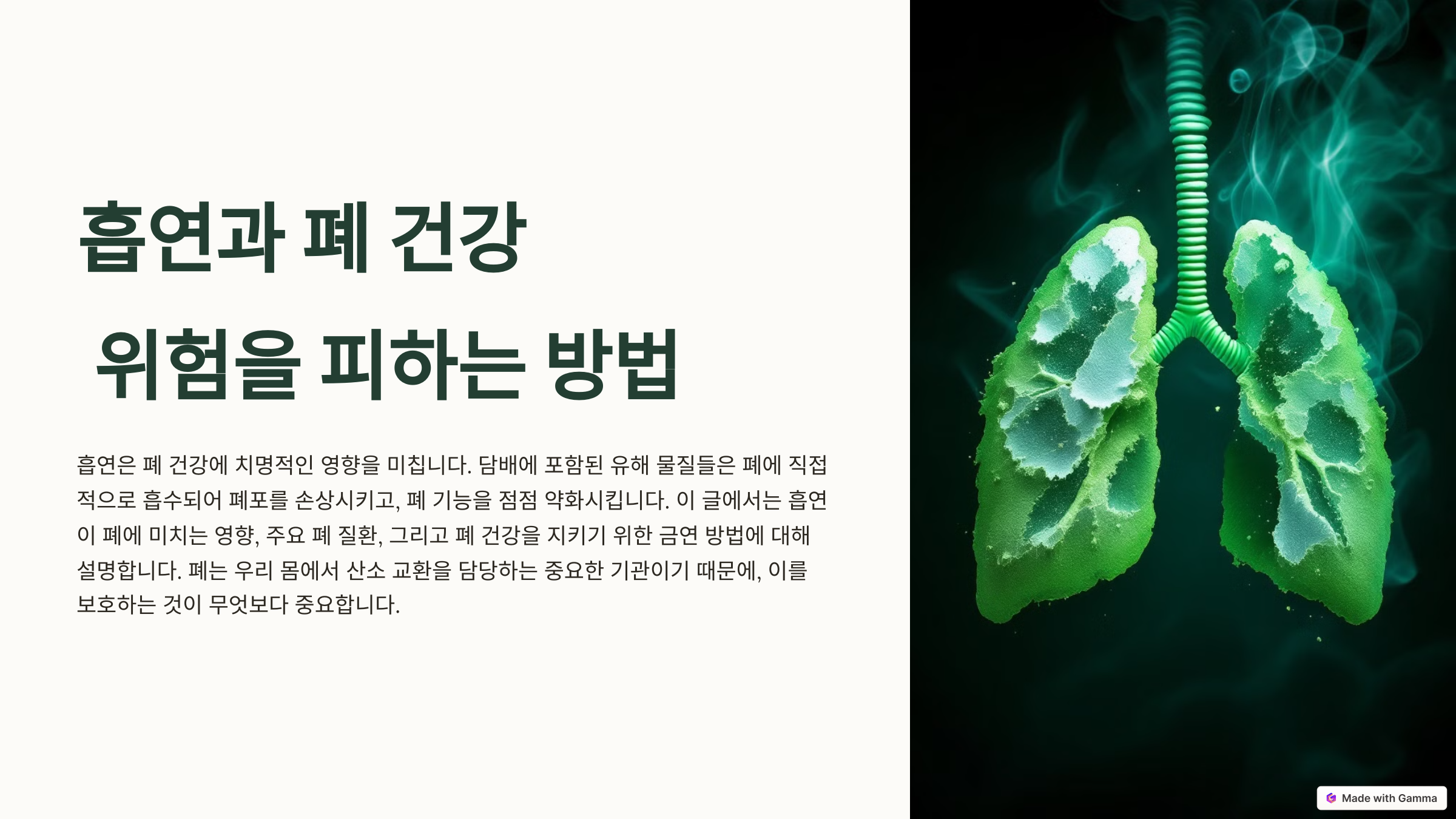 흡연은 폐 건강에 치명적인 영향을 미칩니다. 담배에 포함된 유해 물질들은 폐에 직접적으로 흡수되어 폐포를 손상시키고, 폐 기능을 점점 약화시킵니다. 흡연을 계속할 경우 폐암, 만성 폐쇄성 폐질환(COPD), 폐기종 등의 심각한 질환으로 발전할 수 있습니다. 이 글에서는 흡연이 폐에 어떤 영향을 미치는지, 그리고 폐 건강을 지키기 위해 어떻게 금연을 시작할 수 있는지에 대해 설명합니다. 폐는 우리 몸에서 산소 교환을 담당하는 중요한 기관이기 때문에, 이를 보호하는 것이 무엇보다 중요합니다.