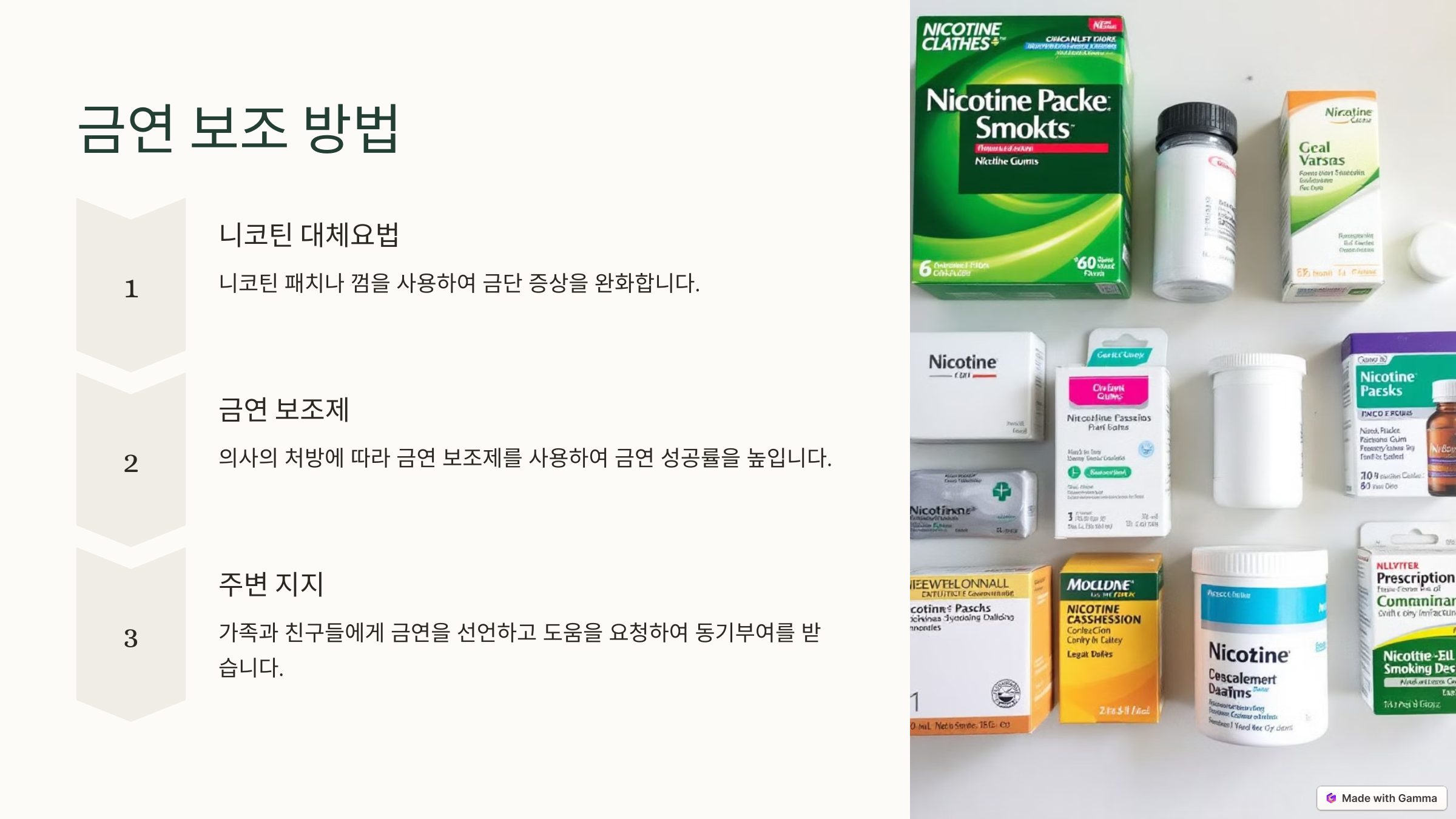 A3: 네, 니코틴 패치나 껌 같은 금연 보조제는 금연 성공률을 높이는 데 도움을 줄 수 있습니다. 다만, 의사의 지시에 따라 사용하는 것이 좋습니다.
