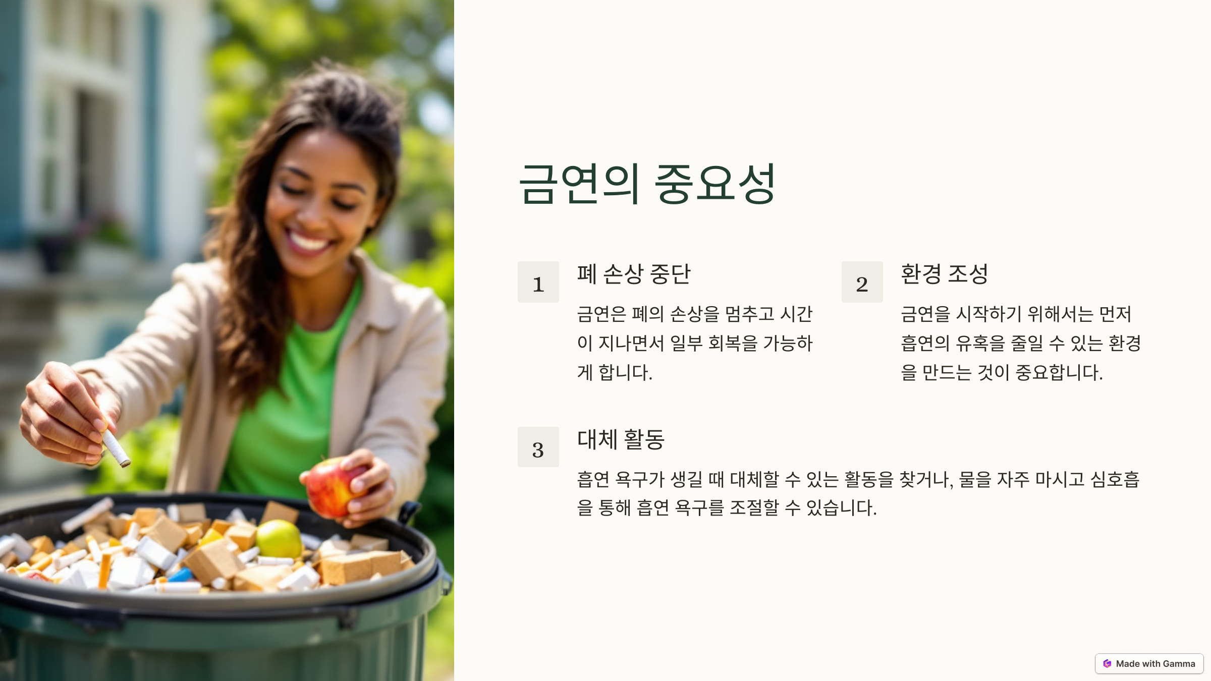 폐 건강을 지키기 위한 가장 효과적인 방법은 금연입니다. 금연은 폐의 손상을 멈추고 시간이 지나면서 일부 회복을 가능하게 합니다. 금연을 시작하기 위해서는 먼저 흡연의 유혹을 줄일 수 있는 환경을 만드는 것이 중요합니다. 흡연 욕구가 생길 때 대체할 수 있는 활동을 찾거나, 물을 자주 마시고 심호흡을 통해 흡연 욕구를 조절할 수 있습니다.